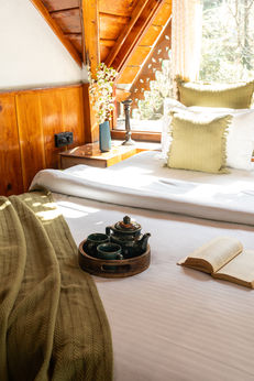 The first floor houses three bedrooms, designed with balconies that overlook the surrounding valley. These balconies become quiet personal corners, perfect for soaking in the gentle morning sun or watching the hills slowly change colour at dusk. A small lounge area on the floor offers additional space to read or unwind.