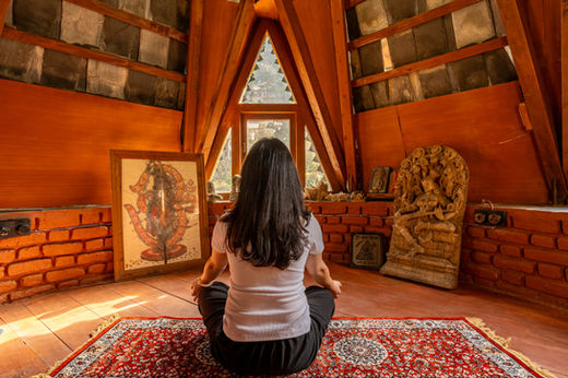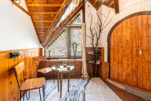 Upstairs, the home opens into three bedrooms, each with balconies overlooking the valley - quiet and personal, designed less as focal points and more as extensions of the home’s stillness. One of the rooms, with its distinct round structure, leads to a tucked-away reading room, while above it, a hidden meditation space, a peaceful sanctuary where guests can open the windows to hear the flowing river below or close them to sit in complete stillness.