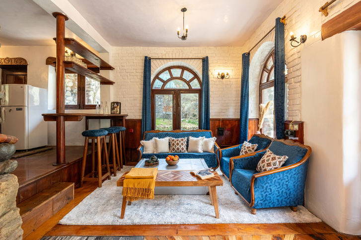While the outdoors feels open and closely tied to nature, the experience shifts noticeably as you step inside. The interiors feel more enclosed, intimate, and rooted in a different time. Cast iron chandeliers, soft ambient lighting, carved wooden details, and thick stone walls come together to create a space that feels almost preserved, less like a modern home, and more like a mountain castle that has quietly existed for decades.
