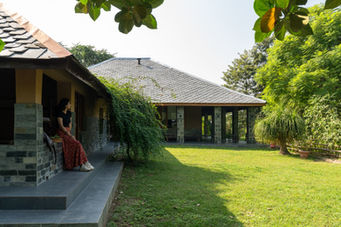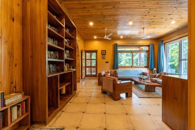 Inside, the home is warm and soulful—wooden interiors, handcrafted furniture, and windows that let nature spill in. The garden hums with life, lemon and mango trees perfuming the breeze, while books on travel, nature, and healing fill the shelves. Mornings begin with chai by the lake, afternoons drift into quiet reading, and evenings gather around a bonfire under the stars.