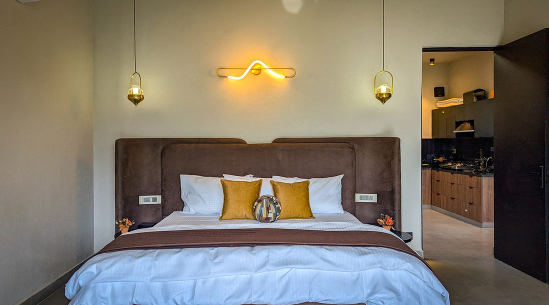 Hushstay x Aainaa is a 01-bedroom farmhouse designed to feel both intimate and indulgent. The spacious bedroom opens up directly to the lush gardens through floor-to-ceiling glass windows, blurring the line between indoors and out so that mornings begin with soft sunlight spilling across the lawns.
